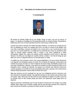 Andrés Felipe de la Cruz Perilla, un joven de 16 años, comparte su autobiografía destacando su infancia amorosa y el apoyo constante de su familia. Refleja sobre sus decisiones, aprendizajes y aspiraciones, incluyendo su deseo de estudiar ingeniería y su experiencia en el Sena. Inspirado por cortometrajes, enfatiza la importancia de luchar por los sueños y salir de la zona de confort.