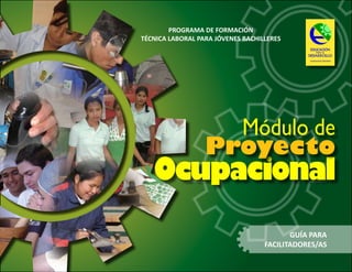 Este documento presenta una guía para facilitadores sobre el Programa de Formación Técnica Laboral para Jóvenes Bachilleres. La guía describe el marco conceptual y metodología del programa, el cual se enfoca en desarrollar competencias técnicas y habilidades de proyecto a través de tres unidades temáticas: autodiagnóstico, análisis del contexto, y plan de acción. El objetivo es mejorar la empleabilidad de los jóvenes a través de actividades prácticas que los ayuden a conocerse a sí m
