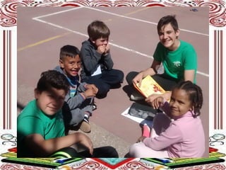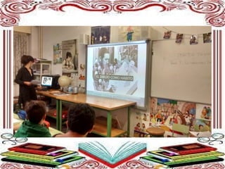 El documento describe las actividades realizadas en una escuela para celebrar el Día del Libro, incluyendo una charla sobre creatividad de una ilustradora, los estudiantes mayores buscando a los más pequeños para compartir actividades como teatro de marionetas y dulces, y el objetivo de celebrar el Día del Libro el 23 de abril en homenaje a Cervantes y Shakespeare.