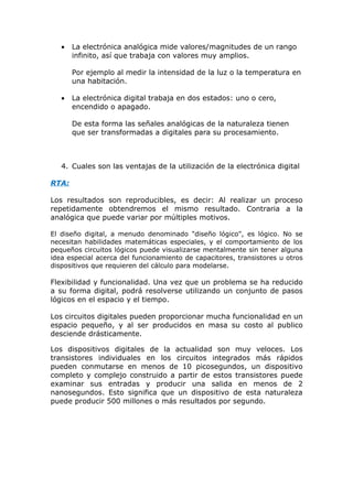 Este documento presenta los resultados de aprendizaje y temas a investigar para la Unidad 1 sobre los fundamentos de la electrónica digital. Los estudiantes deben comprender el origen de la electricidad y las magnitudes eléctricas, e investigar temas como los sistemas analógicos y digitales, las diferencias entre la electrónica analógica y digital, las ventajas de la electrónica digital, sus limitaciones, y conceptos clave como convertidores, compuertas lógicas y tablas de verdad.