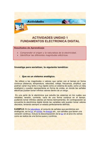 Este documento presenta las actividades de la Unidad 1 sobre Fundamentos de Electrónica Digital. Explica conceptos clave como sistemas analógicos y digitales, y sus diferencias. También describe convertidores analógico-digitales y digital-analesogicos, compuertas lógicas y tablas de verdad. El objetivo es que los estudiantes comprendan los fundamentos de la electricidad y puedan identificar diferentes magnitudes eléctricas.
