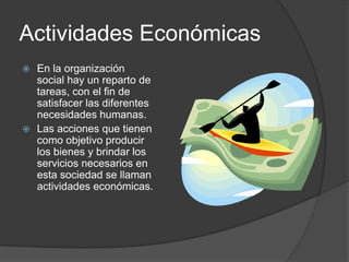 Las actividades económicas son acciones que producen bienes y servicios para satisfacer las necesidades humanas. Estas incluyen el sector primario (agricultura, ganadería, pesca, minería, explotación forestal), el sector secundario (transformación de productos primarios) y el sector terciario (servicios que apoyan a los sectores primario y secundario, como transporte, bancos, comunicaciones).
