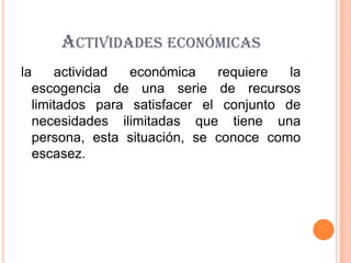 El documento describe tres tipos principales de actividades económicas: la actividad primaria que involucra el uso de recursos naturales como la agricultura y la minería, la actividad secundaria que transforma los productos primarios en manufacturas, y la actividad terciaria que brinda servicios necesarios para las actividades primarias y secundarias como la agricultura, la ganadería y la industria.