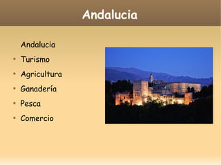 El documento describe las principales actividades económicas de las diferentes comunidades autónomas y ciudades autónomas de España. Andalucía se centra en el turismo, la agricultura, la ganadería y la pesca. En Ceuta y Melilla predomina el sector terciario y comercial, respectivamente. La economía de Murcia ha sido tradicionalmente agrícola. La Comunidad Valenciana se destaca por el textil, la confección y el calzado.