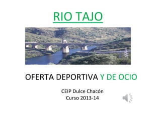 El documento presenta una variedad de actividades deportivas y de ocio disponibles en el río Tajo durante el curso 2013-14, incluyendo piragüismo, senderismo, rutas en bicicleta y diferentes deportes de aventura como escalada y paintball. Se incluyen enlaces a recursos y lugares donde se pueden practicar estas actividades. Se invita a los interesados a disfrutar de las opciones que ofrece el Tajo.