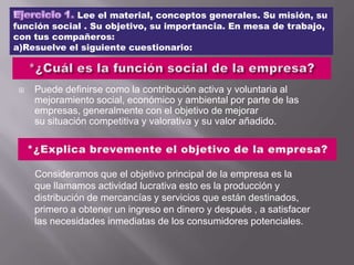 1) El documento presenta una serie de ejercicios realizados por un grupo de estudiantes sobre el tema de la administración de empresas. 2) Los ejercicios incluyen definir conceptos clave como la función social y objetivo de la empresa, así como comparar definiciones de la ley federal del trabajo. 3) También se pide buscar sinónimos de empresa y leer textos sobre aportaciones históricas relacionadas con las empresas.
