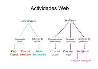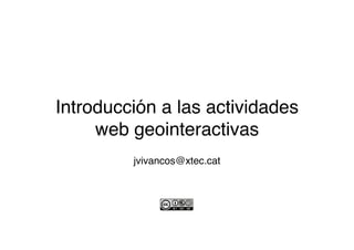 El documento presenta actividades web geointeractivas que promueven el aprendizaje cooperativo a través de herramientas como las webquests y earthquests, enfocándose en la búsqueda y análisis de información geográfica. Se discuten ejemplos prácticos de estas actividades, como la visita virtual a las siete maravillas del mundo y el proyecto 'Vuelta al mundo en 80 minutos'. Además, se sugieren diversas temáticas para desarrollar actividades interactivas relacionadas con exploraciones históricas y naturales.