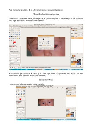 Este documento presenta varios tutoriales sobre cómo editar imágenes en GIMP. Explica cómo eliminar los ojos rojos de una foto, extraer partes de una imagen de un fondo uniforme, recortar una imagen y agregarla a otra, y combinar varias imágenes en una sola.