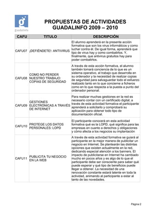 Este documento presenta 17 propuestas de actividades formativas para Guadalinfo 2009-2010. Las actividades cubren una variedad de temas como optimizar un negocio, buscar trabajo, educación en línea, hojas de cálculo, antivirus, copias de seguridad, certificados digitales, protección de datos personales, publicidad en línea, comercio electrónico seguro, selección de personal en línea, creación de sitios web, presentaciones, ampliación de negocios internacionalmente, factura electrónica y trámites administrativos en línea.