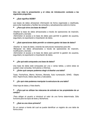 SGSB significa Sistema Gestor de Base de Datos. Un SGBD permite diseñar y manipular bases de datos mediante operaciones como la inserción, modificación y borrado de datos, y la administración de usuarios y permisos. Una base de datos está compuesta de una o más tablas que contienen campos como texto, números o fechas, y sobre las que se pueden crear consultas, formularios e informes para visualizar y manipular los datos.