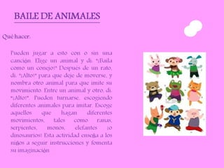 El documento describe varias actividades musicales y al aire libre para realizar con niños de 3 a 5 años. Algunas actividades musicales incluyen moverse al ritmo de música lenta o rápida, crear ritmos con palmadas y percusión corporal, y usar pulseras con cascabeles. Algunas actividades al aire libre son hacer collages con hojas, usar aros hula-hula con música, jugar al tenis con globos usando platos como raquetas, y crear un cuaderno de la naturaleza recolectando objetos durante