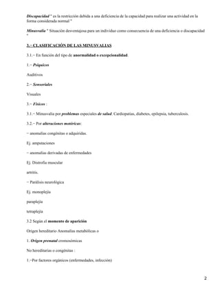 El documento clasifica las actividades físico-deportivas para personas con discapacidades en cinco categorías: rehabilitación, deporte terapéutico, deporte recreativo, deporte de competición y deporte de riesgo y aventura. La rehabilitación se enfoca en recuperar la movilidad, mientras que el deporte terapéutico y recreativo buscan mejorar la calidad de vida. El deporte de competición promueve logros a través de marcas y resultados, y el deporte de riesgo satisface la necesidad de nuevas experiencias.