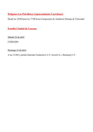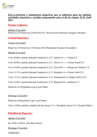 Este documento resume el horario e instalaciones que se utilizarán para diversas actividades deportivas durante el fin de semana del 22-23 de abril de 2017, incluyendo competiciones de natación, fútbol, patinaje y más en la piscina cubierta, ciudad deportiva, pabellón de deportes, poligono Los Polvillares y estadio Ciudad de Lucena.