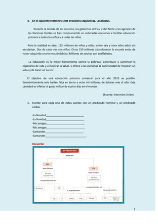 El documento presenta actividades sobre el predicado nominal, incluyendo localizar atributos y sustituirlos por pronombres, identificar sujetos y predicados nominales o verbales en oraciones, y analizar oraciones copulativas. También incluye localizar oraciones copulativas en un texto y escribir oraciones con sujetos y predicados nominales y verbales.