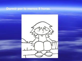 El documento proporciona consejos para cuidar la salud como dormir 8 horas, bañarse regularmente, desayunar de forma saludable, hacer ejercicio, ir al médico y evitar el tabaco o comer con las manos sucias. Además, recomienda comer frutas, verduras, sopa, carne, lácteos y granos enteros, y aconseja a los amigos bañarse, jugar al aire libre y comer de forma saludable.