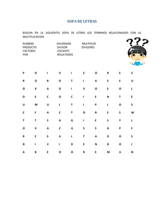 El documento presenta varias actividades y ejercicios relacionados con la multiplicación. Incluye una sopa de letras con términos como producto, divisores y factores. También contiene problemas de multiplicación en diferentes áreas como matemáticas, ciencias sociales, ciencias naturales y tecnología.