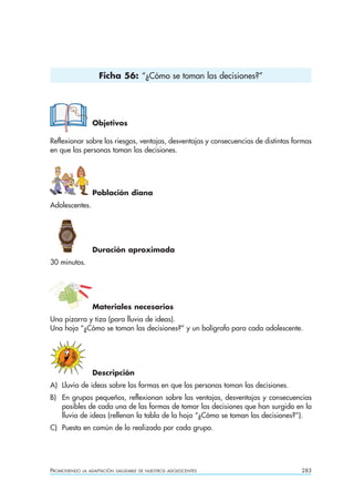 Este documento describe las actividades de la quinta sesión de un taller para adolescentes sobre cómo comunicarse, resolver conflictos y tomar decisiones. La sesión se centra en los valores y la toma de decisiones. Incluye tres actividades: 1) analizar cómo se toman las decisiones actualmente, 2) presentar un modelo para tomar decisiones de forma más informada, y 3) practicar la aplicación del modelo a dilemas reales. El objetivo general es enseñar a los adolescentes a evaluar opciones y tomar decisiones de manera responsable.