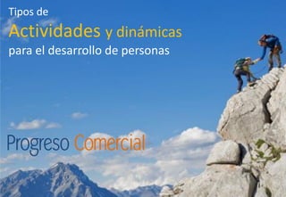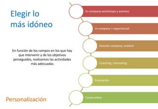 Este documento describe diferentes tipos de actividades y dinámicas para el desarrollo de personas en empresas. Incluye talleres internos, eventos experienciales dentro y fuera de la empresa, coaching, evaluaciones, y recursos en línea. Todas las actividades buscan mejorar competencias, habilidades técnicas y sociales, y la satisfacción general del personal. El objetivo es seleccionar la aproximación más adecuada dependiendo de los objetivos de cada empresa.
