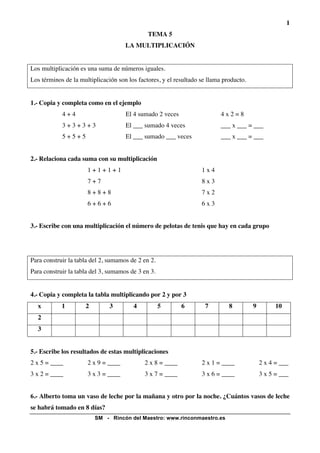 El documento proporciona instrucciones y ejercicios sobre la multiplicación. Explica que la multiplicación es una suma de números iguales, con factores y producto. Incluye ejemplos de sumas iguales expresadas como multiplicaciones, tablas de multiplicar, cálculos de dobles y triples, y problemas resueltos con multiplicaciones.