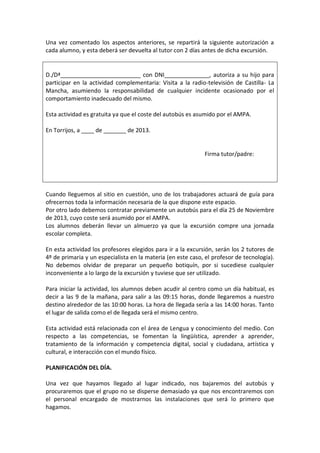 El documento describe una actividad complementaria propuesta para los estudiantes de 4o grado en la Escuela Santísimo Cristo de la Sangre en Torrijos, Toledo. La clase se dividió en grupos para planificar actividades para cada trimestre. Un grupo propuso una excursión a la Radio Televisión de Castilla-La Mancha para el primer trimestre. El documento proporciona detalles sobre la planificación de la excursión, incluida la autorización de los padres, el transporte, la agenda del día y las competencias que se abordarán.