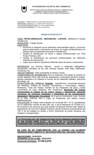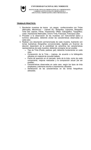 Este documento presenta los objetivos, materiales, estructura y evaluación de un trabajo práctico sobre tintas y lápices para estudiantes de la carrera de Criminalística en la Universidad Nacional del Nordeste. El trabajo requiere que los estudiantes recojan muestras de trazos hechos con diferentes tintas y lápices, los observen con instrumentos ópticos y lumínicos, y describan detalladamente cada muestra con fotografías y detalles sobre el tipo de tinta, su composición y características observadas. El trabajo