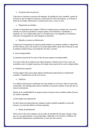 El documento define los activos fijos como bienes de larga duración que una empresa usa para sus operaciones y no están destinados a la venta. Explica que los activos fijos se clasifican en bienes muebles e inmuebles y también en depreciables y no depreciables para propósitos contables. La depreciación es la reducción del valor contable de los activos fijos a medida que envejecen.