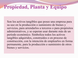 El documento describe conceptos relacionados con propiedad, planta y equipo. Explica que son activos tangibles que una empresa usa para producir bienes y servicios. También habla sobre la depreciación, que es la asignación sistemática del costo de los activos a lo largo de su vida útil. Finalmente, resume diferentes métodos para calcular la depreciación como línea recta, unidades producidas y suma de los dígitos de los años.