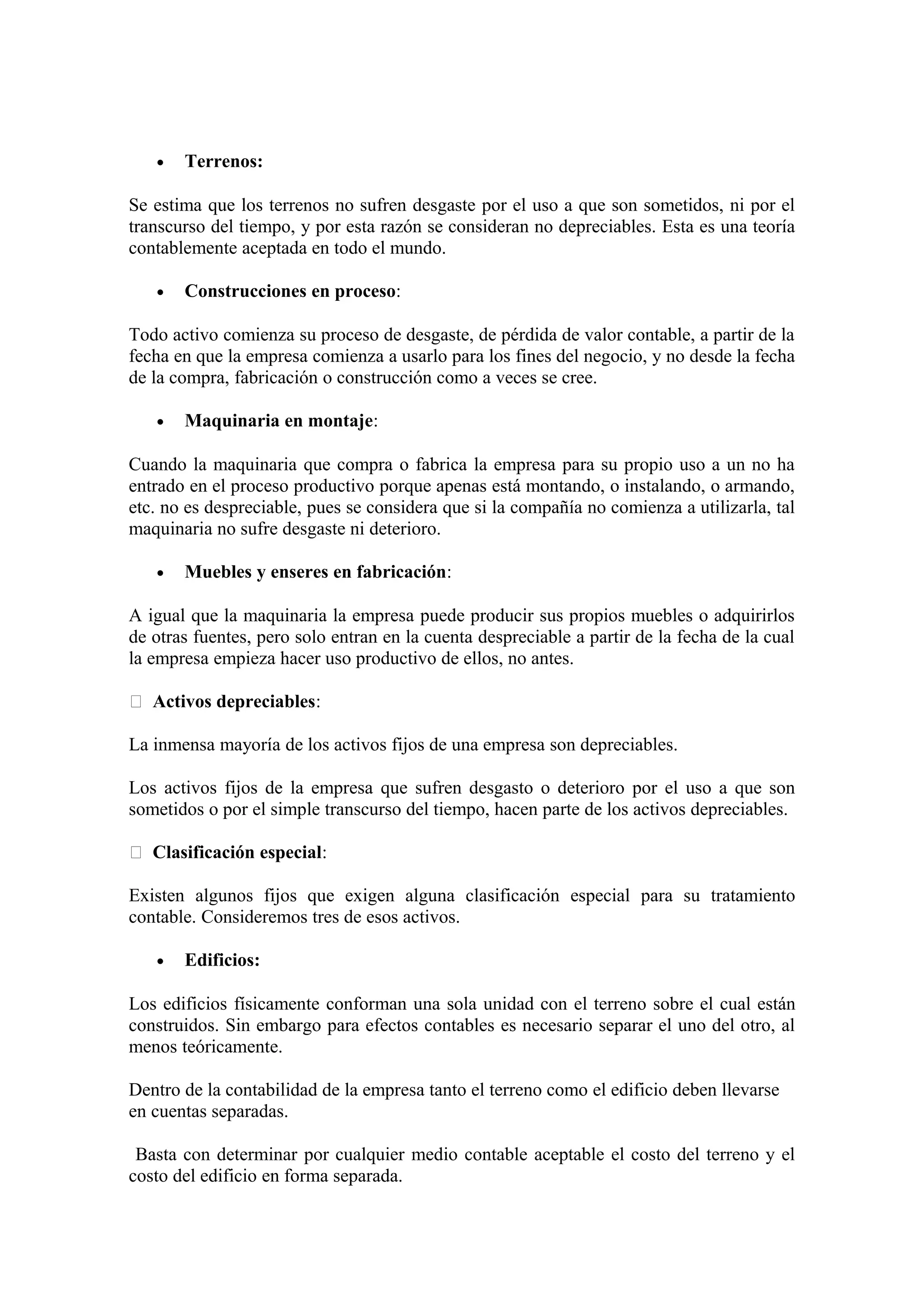 El documento define los activos fijos como bienes de larga duración que no están destinados a la venta. Explica que los activos fijos se clasifican como bienes inmuebles o muebles, y como depreciables o no depreciables. También describe los métodos para calcular la depreciación, incluyendo el método de línea recta, y cómo se contabiliza la depreciación a través de asientos contables.