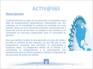 Este documento describe un proyecto llamado ACTIV@S65 que tiene como objetivo fomentar la actividad entre las personas mayores para promover un buen envejecimiento. El proyecto busca capacitar a los mayores para que desarrollen acciones y proyectos que caractericen esta etapa de vida como activa y útil para la sociedad. Se llevará a cabo en varios centros con la participación de asociaciones de mayores y otras organizaciones.