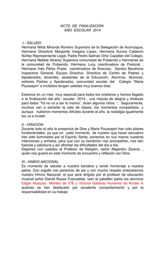 Este documento resume el acto de finalización del año escolar 2014 en el Colegio "Marie Poussepin". El acto incluyó la bienvenida y oración inicial, la entonación del himno nacional, palabras de la directora, cambio de estandartes, presentaciones artísticas, y reconocimientos a los estudiantes por buenos modales, esfuerzo, asistencia, y rendimiento académico. Las palabras finales agradecieron a los presentes y desearon una feliz navidad.