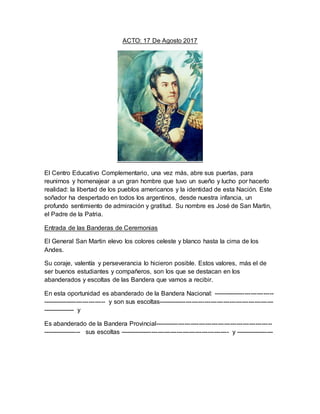 Este documento describe un acto realizado el 17 de agosto de 2017 en el Centro Educativo Complementario para homenajear a José de San Martín, el Padre de la Patria argentino. Se recibieron las banderas nacional y provincial portadas por los abanderados y escoltas. Se cantaron himnos patrios y se dieron palabras alusivas sobre los valores de integración, paz y democracia que San Martín impulsó. Finalmente, las banderas se retiraron felicitando a quienes las portaron.