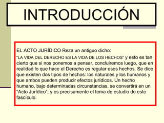 El documento define el acto jurídico como una manifestación de voluntad destinada a crear, regular, modificar o extinguir relaciones jurídicas. Explica que para la validez de un acto jurídico se requiere un agente capaz, un objeto física y jurídicamente posible, un fin lícito y la observancia de la forma prescrita. Además, identifica cuatro vicios de la voluntad que pueden afectar la validez de un acto jurídico: el error, el dolo, la violencia y la intimidación. Final