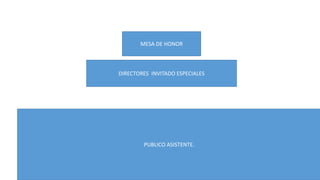 El documento describe los detalles de una mesa de honor y los invitados especiales para un evento cultural. La mesa de honor incluirá al director del centro escolar, director departamental de educación, alcalde municipal, representantes de gerencia de educación media, referente departamental de SSE y representante del CDE. Los invitados especiales incluirán líderes de la comunidad, directores de educación media y referentes de servicio social estudiantil. El director de sede será responsable de coordinar el salón para el acto cultural, preparar salones de exposición para centros educativos