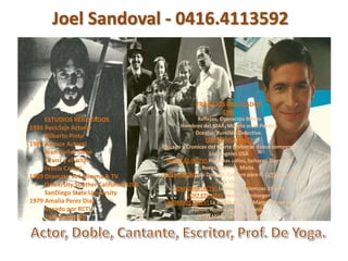 Joel Sandoval ha realizado trabajos en cine, teatro musicales, novelas y comedias desde 1993. Estudió actuación en varias instituciones como la Universidad de California del Sur y la Universidad Estatal de San Diego en Estados Unidos.