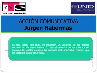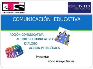 Este documento presenta conceptos clave sobre la comunicación educativa. Define la acción comunicativa como la interacción entre actores comunicativos que intercambian información. Explica que un diálogo es una conversación entre dos o más personas mediante la cual comparten pensamientos, sentimientos y deseos. Finalmente, señala que el objetivo de toda acción pedagógica es iniciar un modelo de comportamiento ético, cultural, social, cognitivo o instrumental en los estudiantes.