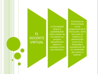El documento describe el proceso educativo virtual y los roles del profesor y estudiante virtuales. Explica que el profesor virtual debe planificar las instrucciones, actualizar contenidos, presentar materiales de forma organizada, orientar a los estudiantes, favorecer la evaluación continua y el aprendizaje colaborativo. Por otro lado, el estudiante virtual debe asumir un rol protagónico a través de la participación activa, el liderazgo compartido y el trabajo autónomo y colaborativo.