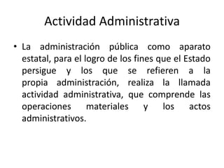 El documento describe los conceptos de actividad administrativa, operaciones materiales y actos administrativos en el ámbito público. Explica que los actos administrativos son decisiones formales emitidas por órganos del Estado en el ejercicio de sus potestades públicas. Señala algunas características como su carácter jurídico y técnico, y provee ejemplos como una orden de detención o una resolución administrativa.