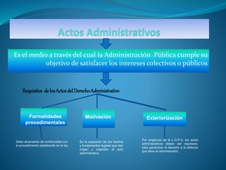 El documento habla sobre los requisitos de los actos del derecho administrativo. Explica que los actos administrativos deben cumplir con formalidades procedimentales establecidas por ley, deben estar motivados por hechos y fundamentos legales, y deben ser expresos de acuerdo a la LOPA para garantizar el derecho a la defensa de los administrados.