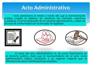 Este documento contiene información sobre los actos administrativos. Define los actos administrativos como la forma en que la administración pública cumple objetivos de interés público. Explica que los actos administrativos se clasifican en normativos y no normativos, y también en generales e individuales. Finalmente, detalla algunos elementos esenciales de los actos administrativos como la competencia del órgano, voluntad, contenido, motivos, finalidad y formalidades.