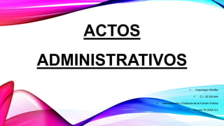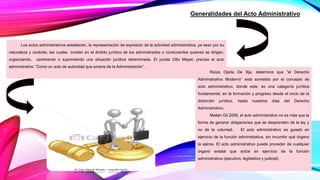 El documento describe los actos administrativos y su clasificación. Explica que los actos administrativos establecen la expresión de la actividad administrativa y pueden incidir en la situación jurídica de los administrados. Se clasifican según sus efectos, contenido, impugnabilidad, y requisitos de forma y fondo, como la competencia, base legal, causa, y finalidad. También requieren seguir procedimientos establecidos para ser válidos y están sujetos a control jurisdiccional.
