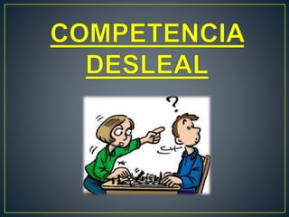 Este documento habla sobre la competencia desleal y sus diferentes tipos según la legislación peruana. Define la competencia como la concurrencia de varios competidores en un mercado y explica que la competencia desleal rompe el principio de buena fe empresarial. Luego clasifica los diferentes actos de competencia desleal y describe algunos ejemplos como los actos de engaño, violación de secretos empresariales y sabotaje. Finalmente, explica que para que un acto sea considerado competencia desleal debe ser contrario a la buena fe entre competid