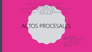 Los actos procesales son manifestaciones de voluntad con relevancia jurídica dentro de un proceso legal. Pueden ser realizados por órganos judiciales, fiscales o las partes involucradas. Se clasifican según su autor, tipo y efecto. Deben llevarse a cabo dentro de ciertos plazos, lugares y formas establecidas por la ley para ser válidos y poder resolver el caso.