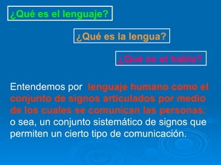El documento explica las características del lenguaje humano y la diferencia entre lenguaje, lengua y habla. Define al lenguaje como un sistema de signos que permite la comunicación entre personas. Explica que la lingüística estudia el lenguaje y que este se ha formado en la sociedad. También describe los tres tipos de actos de habla: locutivo, ilocutivo y perlocutivo. Finalmente, clasifica los actos de habla en representativos, directivos, compromisorios y expresivos.