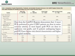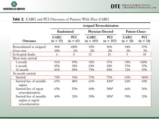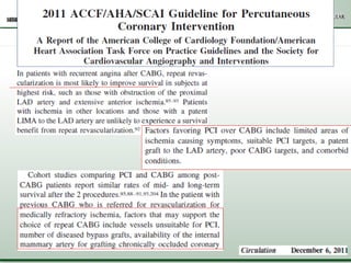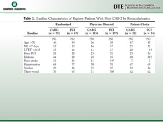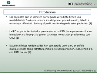 Este documento compara las intervenciones percutáneas coronarias (IPC) versus la cirugía de revascularización miocárdica (CRM) en pacientes que ya han tenido una CRM previa. Analiza varios estudios que muestran que la IPC tiene peores resultados que la CRM en este grupo de pacientes, aunque depende de factores como la anatomía coronaria y el riesgo clínico. Se necesitan más estudios específicos en esta población en crecimiento para guiar mejor la elección del tratamiento de revascularización.