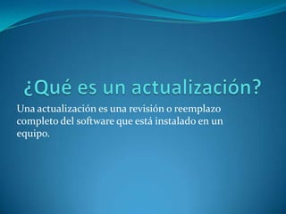 Una actualización es una revisión o reemplazo del software instalado que ofrece protección contra actividades malintencionadas y soluciona problemas. Es importante descargar e instalar actualizaciones de forma regular ya que dejan el equipo expuesto a riesgos si no se instalan. Se recomienda configurar las actualizaciones automáticas para instalar actualizaciones importantes a medida que estén disponibles.