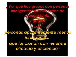 El documento aborda la importancia de crear grupos inteligentes y efectivos, destacando aspectos como la cultura del grupo, la coordinación, y la integración del bienestar de sus miembros. Propone un enfoque sistémico para analizar las dinámicas grupales, así como estrategias para mejorar la delegación y gestión del tiempo, fortaleciendo la colaboración y la productividad del equipo. Además, se presentan ejercicios prácticos y reflexiones para optimizar el funcionamiento grupal y potenciar la inteligencia colectiva.