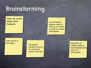 El documento discute la brecha tecnológica entre profesores y estudiantes en el Colegio Melipilla. Los profesores se sienten frustrados al no poder aprovechar plenamente las herramientas tecnológicas que usan fácilmente los estudiantes. Se propone acortar esta brecha mediante tutorías personalizadas para los profesores, incluyendo herramientas atractivas en la enseñanza sin quitarles tiempo a los docentes. Sin embargo, será un desafío implementar esto debido a las limitaciones de tiempo y recursos