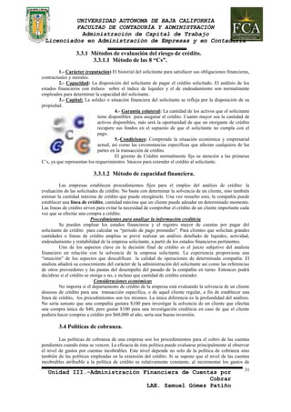 Este documento trata sobre la administración financiera de cuentas por cobrar. Explica conceptos como políticas de crédito, análisis de crédito, políticas de cobranza y descuentos por pronto pago. Detalla métodos para evaluar el riesgo de crédito de los clientes, como el método de las 8 "Cs" y el análisis de capacidad financiera. También analiza cómo los cambios en las políticas de crédito afectan variables como volumen de ventas, inversión en cuentas por cobrar y gastos por