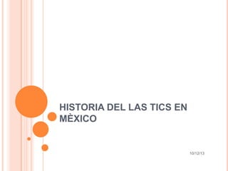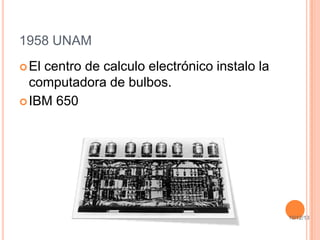 El documento resume brevemente la historia de las tecnologías de la información y la comunicación en México desde 1958 hasta 2003, destacando hitos como la instalación de las primeras computadoras en la UNAM en 1958, la adquisición del primer sistema satelital en 1966, el procesamiento electrónico de datos del censo en 1970, la creación del consorcio Televisa en 1972, y el inicio del programa E-México en 2000 para reducir la brecha digital.
