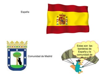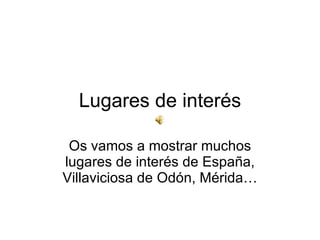 Este documento presenta una lista de varios lugares de interés turísticos en diferentes ciudades y regiones de España como Villaviciosa de Odón, Madrid, Bilbao, Mérida, Segovia, Andalucía y Santiago de Compostela. Incluye fotos e información básica sobre atracciones populares como castillos, plazas, teatros romanos, catedrales y otros sitios históricos y culturales significativos.